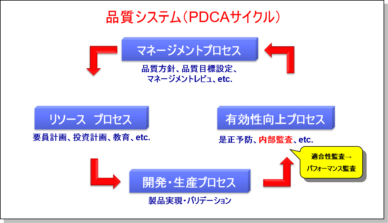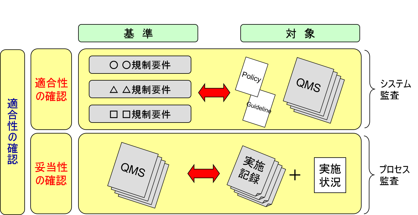 プロセス監査では、適合性のあるQMSのもと、適切に品質管理システムが履行されていることを確認(妥当性の確認)する。