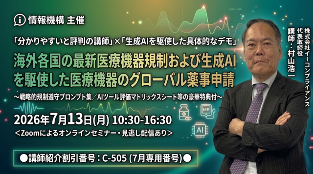 生成AI関連セミナー 生成AI関連セミナー開催日 タイトル 4/22 ヒューマノイドロボットを中心としたフィジカルAIの最新動向と日本の現在地・企業戦略へのヒント 4/24 【オンデマンド配信】 GAA(Gate-All-Around)覇権戦争と AIデータセンターの衝撃への羅針盤 5/12 【第9回】AI Compliance研究会 5/18 生成AIを駆使した医療機器設計開発・リスクマネジメント・ユーザビリティエンジニアリング管理入門【全3回シリーズ:①ME機器編、②IVD機器編、③試薬編】 5/20 5G/6G・V2X・AI時代に求められる 電波吸収体・電波シールドの設計と特性評価 5/22 日本・米国・欧州の医薬品GMP比較と生成AIを駆使した最新要求事項対応 5/22 【オンデマンド配信】 特許情報からみた 次世代フォトニクスネットワーク実現への道 光電融合材料・技術[2025] 5/28 生成AIを活用した技術文書・論文作成の実践と業務効率化 6/3 【第10回】AI Compliance研究会 7/7 【第11回】AI Compliance研究会 8/4 【第12回】AI Compliance研究会 9/3 【第13回】AI Compliance研究会 10/6 【第14回】AI Compliance研究会 11/5 【第15回】AI Compliance研究会 12/3 【第16回】AI Compliance研究会 医薬品関連セミナー