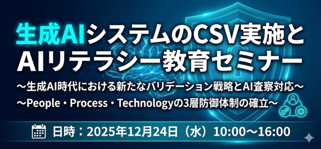 本セミナーでは、生成AI時代における新たなバリデーション戦略とAI査察対応について、People・Process・Technologyの3層防御体制の確立を中心に解説します。