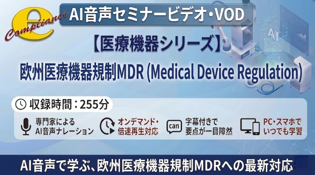 MDR(Medical Device Regulation)/MDD→MDR移行/臨床評価・CER/PMCF・PMS・ビジランス/GSPR/UDI/EUDAMED/クラス分類/技術文書/適合性評価手順/経済事業者 等々。